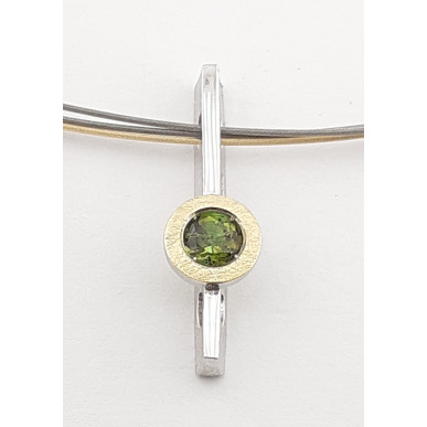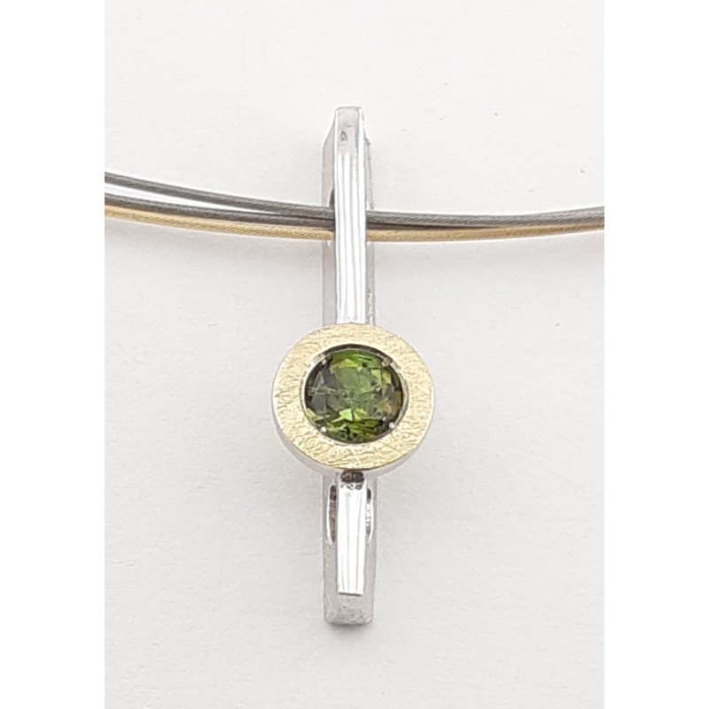 Colgante de 20mm de alto por 7mm de ancho fabricado en plata de 1ª ley 925mls rodiada, oro de 18k 750mls rallado y turmalina de 4mm color verde. Una pieza sofisticada que no pasará de moda nunca.