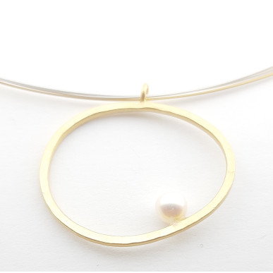Collar para mujer fabricado artesanalmente en plata de 1ª ley 925 mls, terminado en martele con baño de oro amarillo y perla de agua dulce de 5,25mm de diámetro , colgante en forma de medida largo x ancho 32,00 x 26,00mm , con cable de acero, largo total 43 cm. Cierre de serpiente.