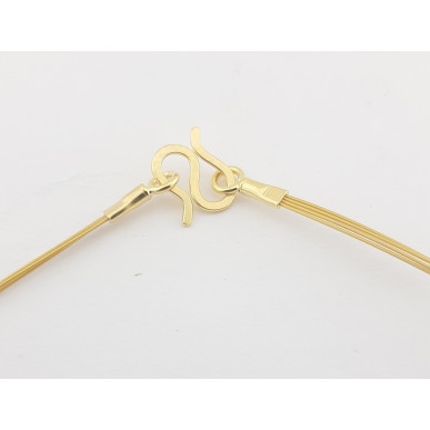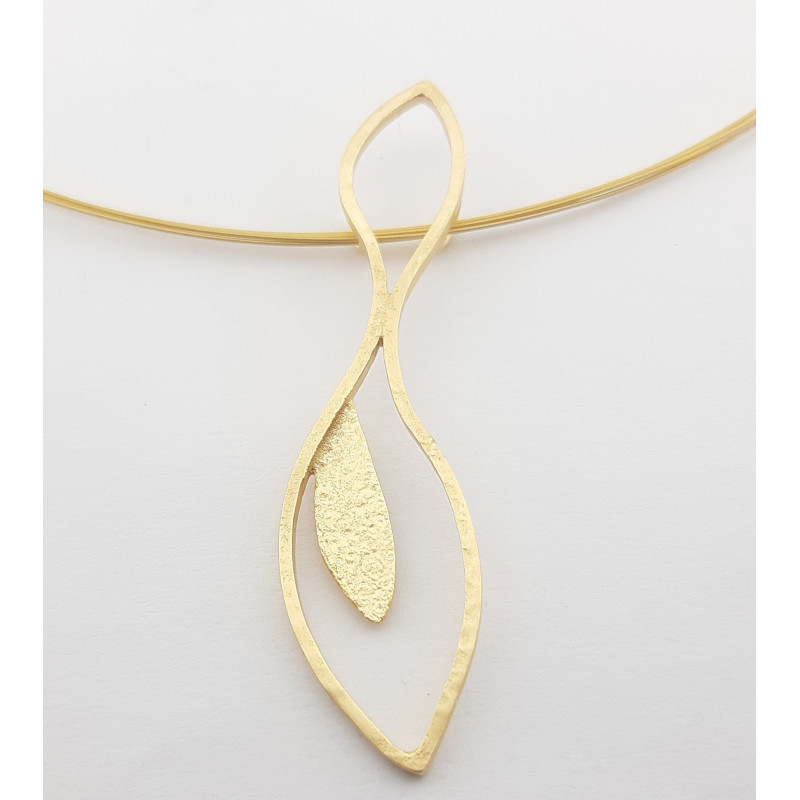 Collar para mujer fabricado artesanalmente en plata de 1ª ley 925 mls con baño de oro amarillo con forma de hoja, terminado en martele y mate satinado, de medida ancho 14,650 mm en definición largo 55,50cmm con cable de acero, largo total 43 cm .Cierre serpiente.