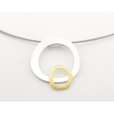 Collar para mujer en plata de 1ª ley 925mls, collar con dos circulos irregulares uno terminado en satinado con una medida de diámetro de 25,50 mm y otro circulo más pequeño en baño de oro amarillo con un diámetro de 13,00mm , largo total del colgante 30.20mm , incluido un collar con tres hilos de acero con cierre de mosquetón medida de largo 42 cm.