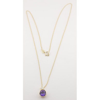 Cadena y colgante en oro de 18ktes 750mls , cadena de largo de 40cm y cierre de reasa , colagte con piedra amatista de diámetro 7,00mm.medida del colgante 10,25mm y diamante talla briillante de peso 0,04 , diamante color H pureza VS