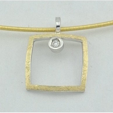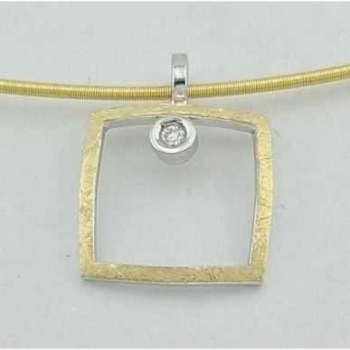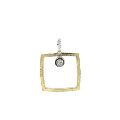 Colgante de 14mm de ancho por 14mm de largo fabricado en plata rodiada, oro de 18k mate y brillante creado en laboratorio de 0.02ct. Una pieza básica, pero a la vez especial.