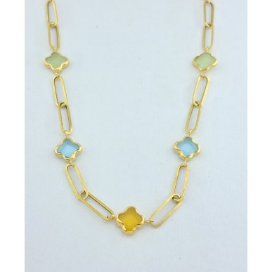 Collar para mujer fabricado en oro amarillo de 1ª ley 18kilates 750mls , collar con eslabón rectangular hueco de medida 10,50x3,30 , con 9 piedras de colores variados en forma de flor de 4 hojas , cierre de reasa y largo total de 44cm