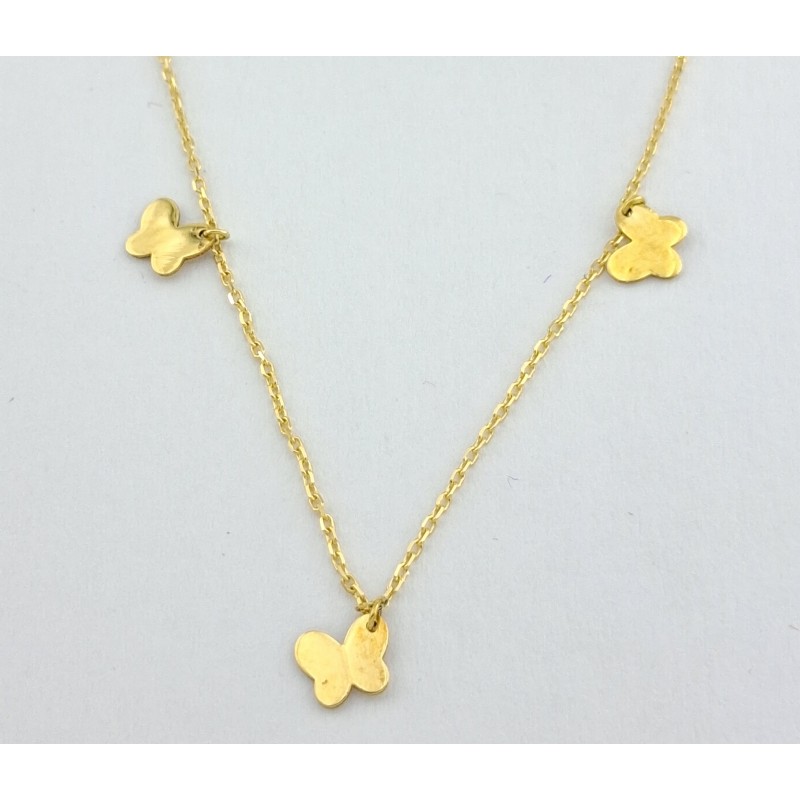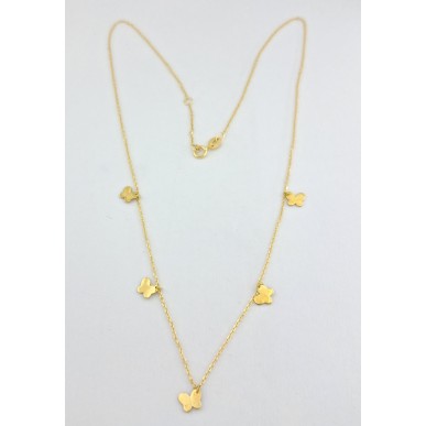 Collar para mujer fabricado en oro amarillo de 1ª ley 18kilates 750mls , collar con cinco mariposas colgantes y cadena modelo forzada con una medida ajustable de 39cm y de 41cm cierre de reasa.