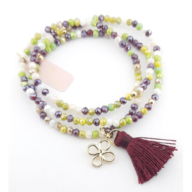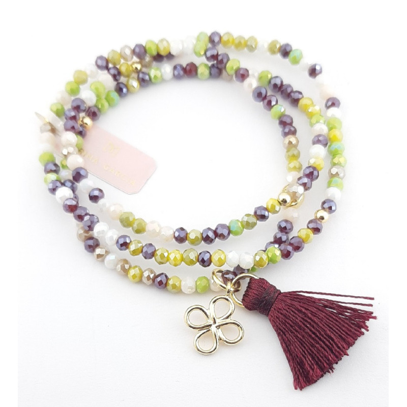 Pulsera Marina García para mujer de la colección Zen Burgundy fabricada en plata bañada en oro amarillo compuesta por cristales Strass facetados en varias tonalidades . Cuenta con un abalorio colgante en forma de Trébol en plata bañada en oro. Esta pulsera de diseño elástico puede ser utilizada como tobillera y gargantilla.