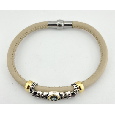 Pulsera para mujer en plata de 1ª ley 925 mls de la marca Top Silver, con circulo tipo orla en baño de oro amarillo y una piedra redonda central y baño de oro amarillo con abalorios en piedras de color , y la piel en color beige con un diámetro de 4,50mm y cierre con un potente iman
