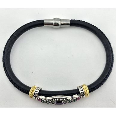 Pulsera para mujer en plata de 1ª ley 925 mls de la marca Top Silver, con orla ovalada en piedras de colores variados y abalorios en plata con baño de oro amarillo , y la piel en color negro con un diámetro de 4,00mm y cierre con un potente iman