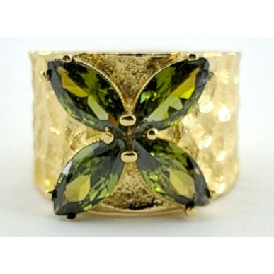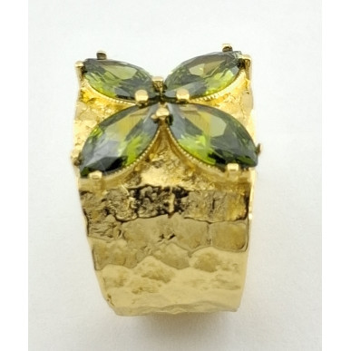 Anillo para mujer en plata de 1ª ley 925 mls y con baño de oro amarillo de la marca Top Silver, anillo con piedras de color olivina en forma de flor.