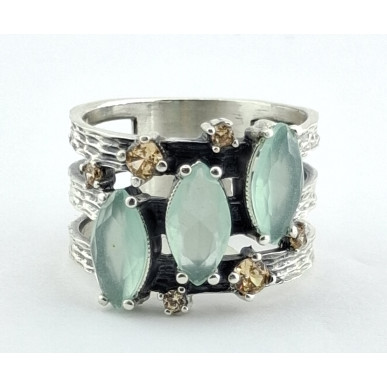 Anillo para mujer en plata de 1ª ley 925 mls de la marca Top Silver, anillo con aro de tres tiras con textura y con circonitas de colores verde y marrón .