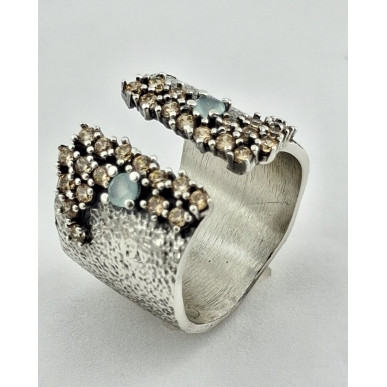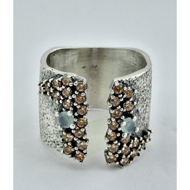 Anillo para mujer en plata de 1ª ley 925 mls de la marca Top Silver, anillo abierto por la parte central con textura y con cascada de piedras circonitas de colores verde y marrón .