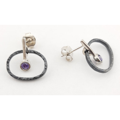 Pendientes para mujer en plata de 1ª ley 925mls, pendiente con forma de ovalo terminado en matizado en martele y plata oxidada con una medida de 18,00 x 17,00 mm la parte central en plata matizada con circonita en color amatista engastada ,cierre a presión.