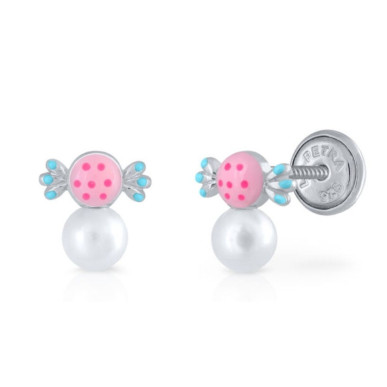 Pendientes fabricadas en plata de 1ª ley 925 mls , con baño de rodio para dar mayor resistencia, la joya de plata que recibe una capa de rodio posee una vida útil más larga y en forma de caramelo con perlas naturales , con cierre a rosca