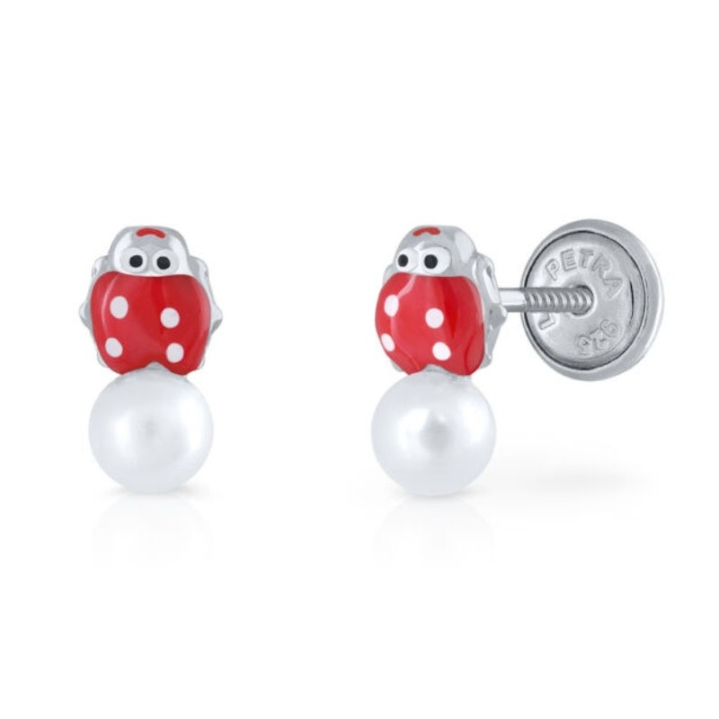 Pendientes fabricadas en plata de 1ª ley 925 mls , con baño de rodio para dar mayor resistencia, la joya de plata que recibe una capa de rodio posee una vida útil más larga y en forma de mariquita con perlas naturales , con cierre a rosca