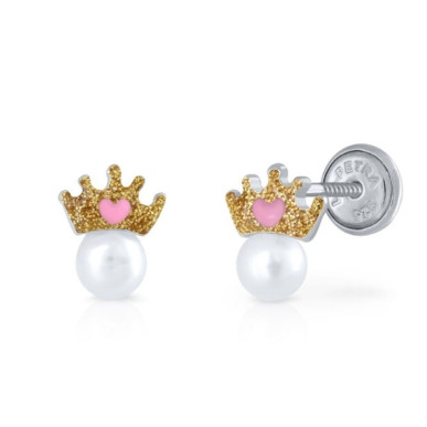 Pendientes fabricadas en plata de 1ª ley 925 mls , con baño de rodio para dar mayor resistencia, la joya de plata que recibe una capa de rodio posee una vida útil más larga y en forma de corona con perlas naturales , con cierre a rosca