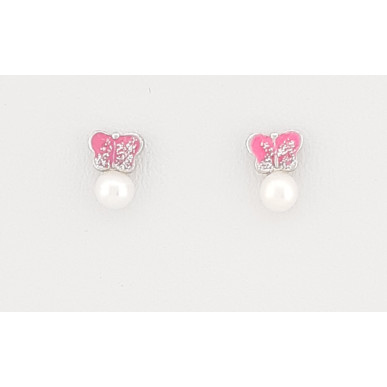 Pendientes fabricadas en plata de 1ª ley 925 mls , con baño de rodio para dar mayor resistencia, la joya de plata que recibe una capa de rodio posee una vida útil más larga y en forma de mariposa con perlas naturales , con cierre a rosca