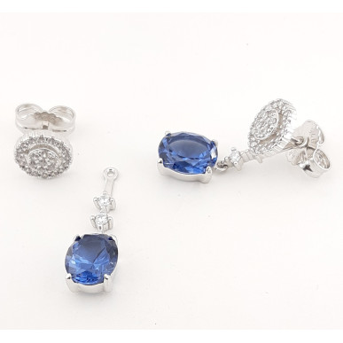 Pendientes para mujer de plata de primera ley (925mls) con baño de rodio circonita blanca y piedra sintetica en color azul y cierre a presión .Son desmontables para llevar solo la corona o si prefieres con el colgante con piedra de color. medida total de larga 33.50 mm medida de la corona en circonitas 10.80 mm de diámetro medida de la piedra azul oval 9x11 mm