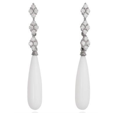 Pendientes de plata de primera ley (925) con baño de rodio, circonita blanca y ágata blanca tipo lagrima. (largo: 4,8 cm.)