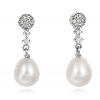 Pendientes de plata de primera ley (925) con baño de rodio y circonita blanca en pavé superior y perlas cultivadas naturales. (largo: 2,5 cm.) Cierre a presión