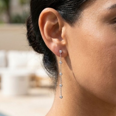 Elegantes pendientes colgantes de diseño lineal, fabricados en plata de ley 925 con acabado en rodio. Una pieza sofisticada que presenta una hilera fluida de circonitas blancas, ideal para aportar un toque de lujo y brillo a cualquier estilismo.