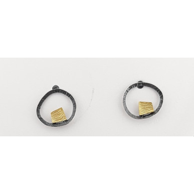 Pendientes para mujer en plata de 1ª ley 925 mls, pendientes en forma irregular terminados en matizado martele y plata oxidada con una medida 16,00x15,00mm y en el centro figura geometrica en baño de oro amarillo, cierre a presión.