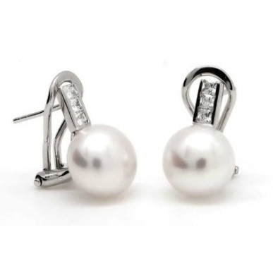 Pendientes para mujer fabricados en plata de 1ª ley 925 mls, modelo TU-YO .Pendientes de perla ideales para lucir junto a otros tipos de pendientes. Pendientes de plata de estilo "Tú y yo" formados por un motivo lineal de circonitas blancas en talla princesa rodeados por una silueta de plata lisa y acabados con perlas de agua dulce de diámetro 10,00 mm medida total 15,50 mm de largo , y con cierre Omega.