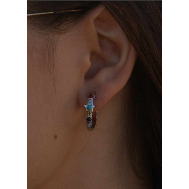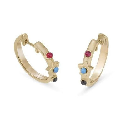 Pendientes aros dorados en plata para mujer. El diseño perfecto para coronar tus estilismos. Pendientes aro dorados en plata con triple motivo y detalle de esmalte en color rojo, azul y negro. Ideal para lucir junto al anillo a juego.