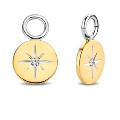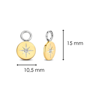 Colgantes para los pendientes tipo aros , se pueden colgar en los aros referencia 7215SI - 7838ZY - 7813TQ - 7848PW - 7839SY , o en otros aros de un maximo 3 mm de diámetro.Estos charms 9224ZY de TI SENTO - Milano bañados en oro tienen centros de circonita blanca y grabados de estrellas por todas partes. Son recordatorios para mantener la vista en las estrellas y los pies en la tierra.