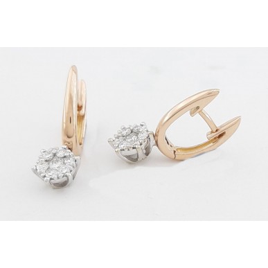 Pendientes para mujer aros ovalados en oro rosé de 18kt 750mls con un roseton colgante en oro blanco de 18kt 750mls , rosetón con diamantes talla brillante , 12 diamantes con un peso total de 0,28qtes y 2 diamantes centrales con un peso total de 0.14qtes Medida total del pendiente 21 mm de largo Cierre tipo catalán
