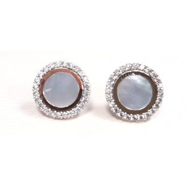 Pendientes para mujer fabricado en plata de 1ª ley 925 mls y oro de 9 kts , orla con piedras blancas y redonda central en nacar de 9 mm de diámetro , orla de 16,50 mm de diámetro , cierre a presión.