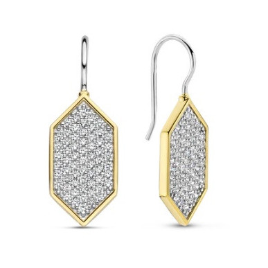 Estos aretes de plata TI SENTO 7942ZY lucen un pavé de deslumbrantes piedras de circonita cúbica blanca engarzadas en engastes chapados en oro amarillo. Los aretes están elaborados con plata de ley 925 de la más alta calidad y luego recubiertos con una capa de platino para protegerlos del uso diario y mantenerlos encantadores. Sus formas geométricas clásicas y modernas crean piezas cautivadoras y elegantes. Las piedras de circonita cúbica están engarzadas de forma segura en un marco elegante y liviano, lo que permite que los aretes adornen con gracia sus orejas. Agregarán un toque de glamour a cualquier conjunto, convirtiéndolos en el par perfecto para realzar tu declaración de moda. Recoge tu cabello y dales el protagonismo. Están completamente libres de níquel y son hipoalergénicos.
