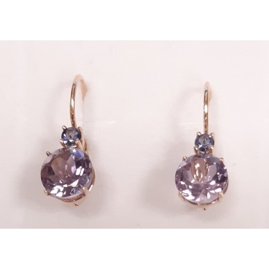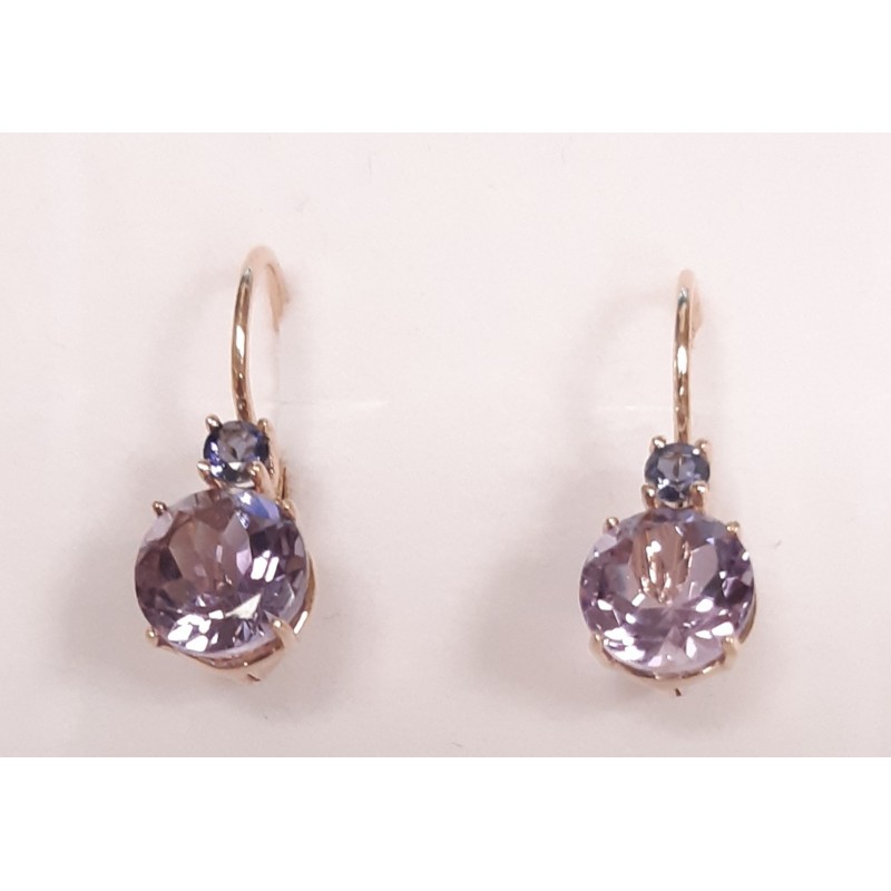 Pendientes para mujer fabricadas en oro rosa de 1º ley 750mls , pendientes colgantes con piedra natural redonda facetada en amatista de medida 8mm de diámetro y iolita redonda facetada natural de medida 3mm de diámetro tipo de cierre Italiano.