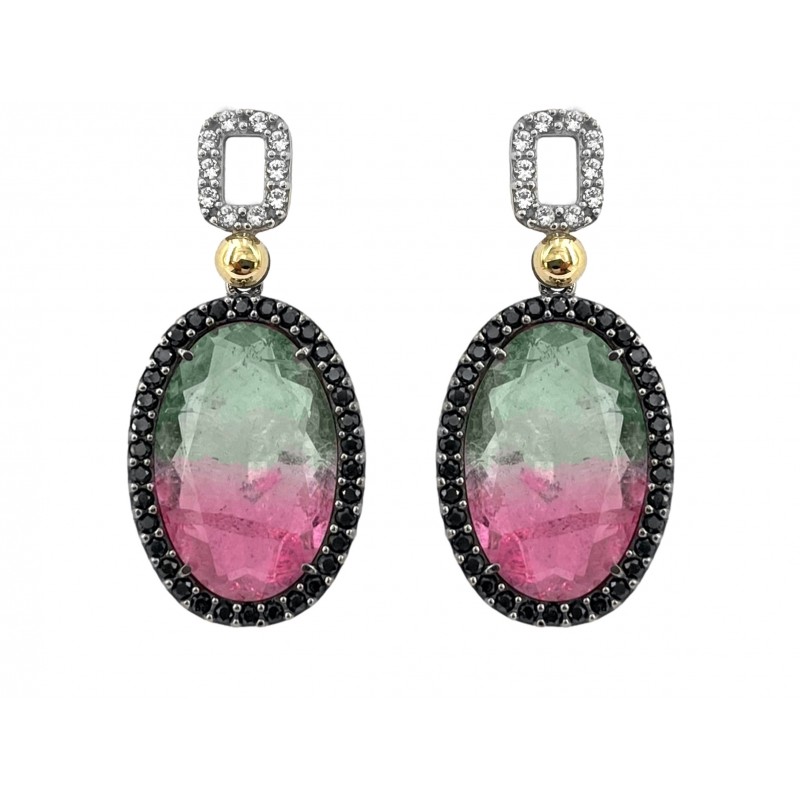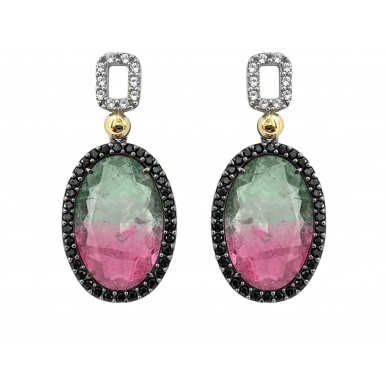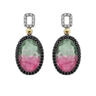 Pendientes Plata 925/000 y oro laminado de 18k, dobletes Cuarzo Turmalina bicolor, espinelas negras y zafiros blancos