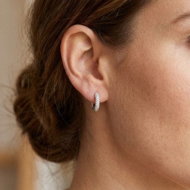 El elemento distintivo de este diseño es su doble fila de circonitas cúbicas, cuidadosamente cortadas y dispuestas en un engaste de canal. Esta disposición garantiza que las piedras dominen la vista frontal, creando una superficie de luz continua cuando se lucen. Gracias a su diseño equilibrado, pueden usarse de forma individual para un look minimalista o como base para los dijes de oreja (Ear Charms) de la firma, permitiendo una personalización total de la joya.