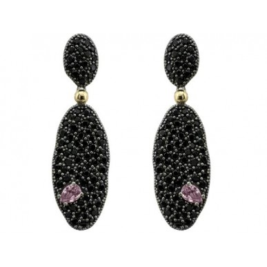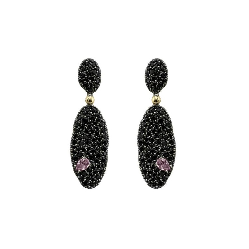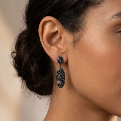 Pendientes de la colección PUA de Bohemme, diseñados para la mujer actual en plata rodiada negra y oro de 18K. Una pieza que destaca por su piedra central rosa en forma de púa y un elegante pavé de espinelas negras.