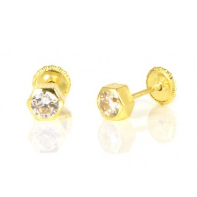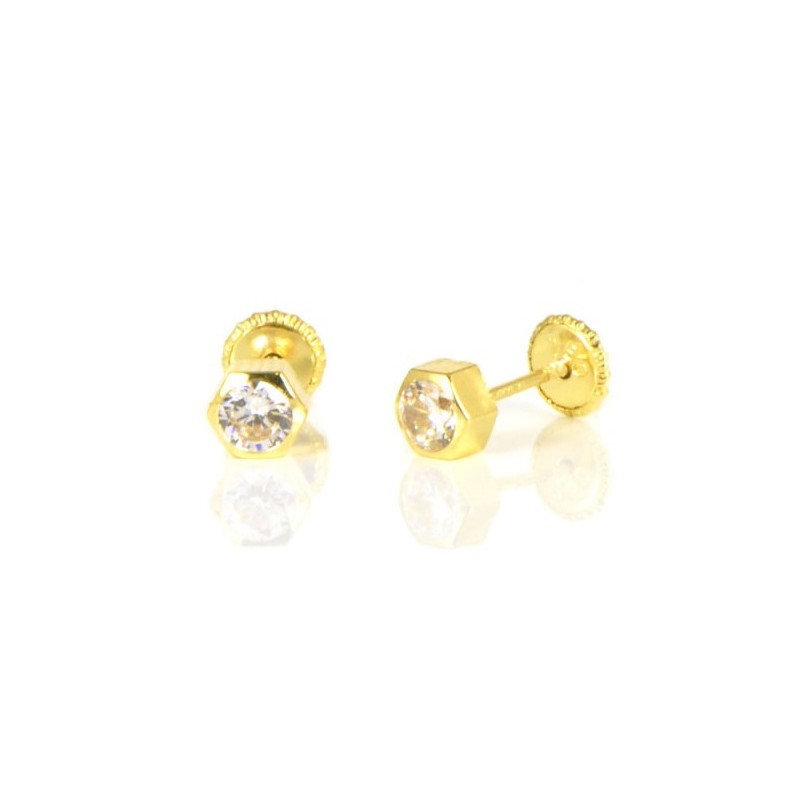 Pendientes fabricados en oro amarillo de 18 Kts 750MLS de sencillo diseño exagonal con circonita redonda en su interior, hace un ancho de 4.5 milímetros, su cierre es a rosca