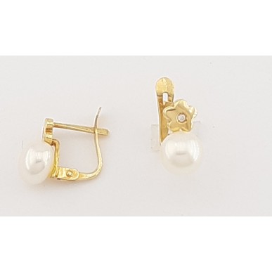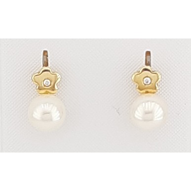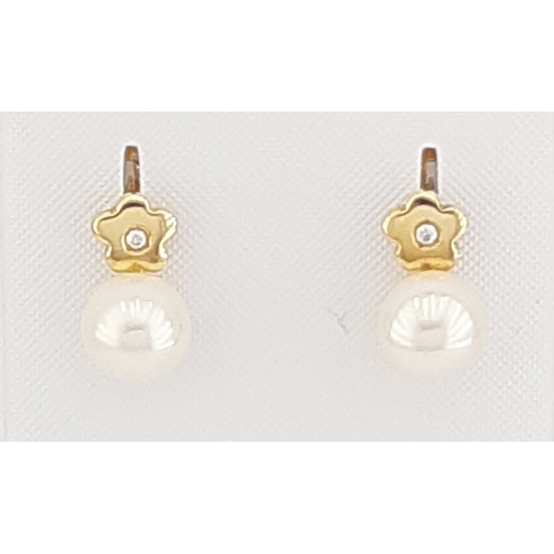 Pendientes para mujer en oro amarillo de 1ª ley 750 mls modelo TU-YO , con perla natural cultivada tipo botón de 6.25 mm de diámetro y montura en forma de flor con circonita blanca al centro y cierre catalán. Medida del pendiente 10.80mm
