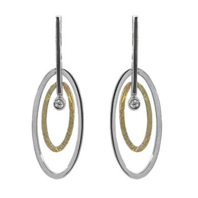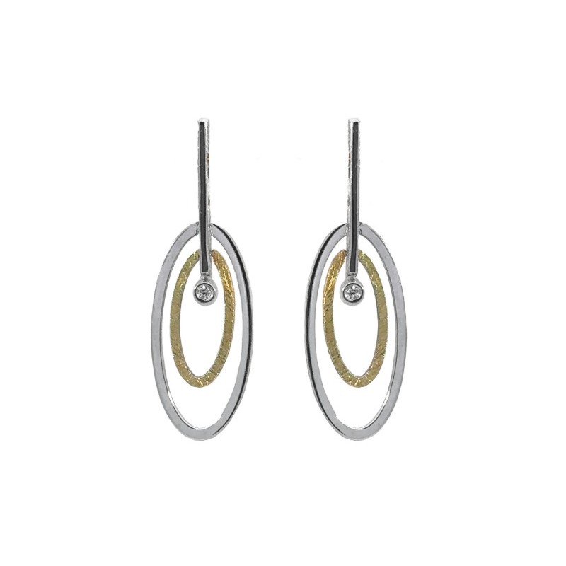 Pendientes largos colgantes de 35mm de alto por 12mm de ancho fabricados en plata de 1ª ley 925mls rodiada, oro de 18k 750mls y brillante de 0.030 ct. Unos pendientes originales y bellos. Cierre a presión