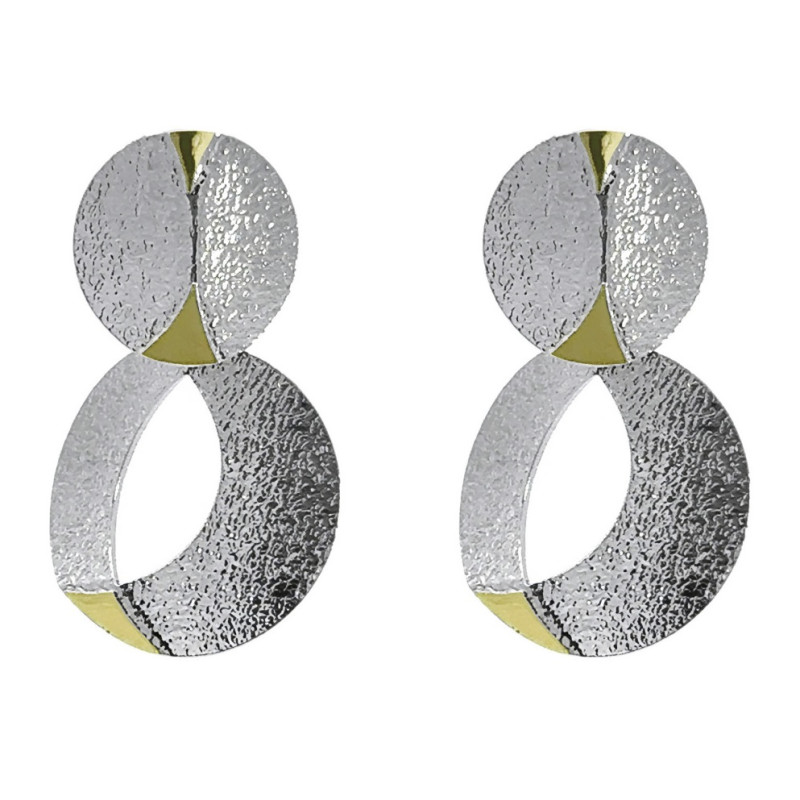 Pendientes en dos piezas de 25mm de largo por 15mm de ancho fabricados en plata 1ª ley 925mls rodiada y oro de 18k 750mls pulido. Una pieza moderna y original.
