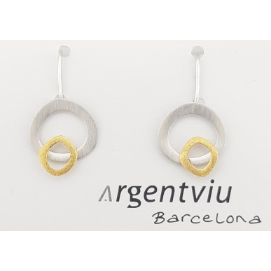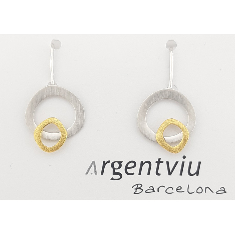 Pendientes para mujer en plata de 1ª ley 925mls, pendiente con dos circulos irregulares uno terminado en satinado con una medida de diámetro de 15,50 mm y otro circulo más pequeño en baño de oro amarillo con un diámetro de 8,00mm , largo total 30mm y cierre en gancho tipo Hippie.