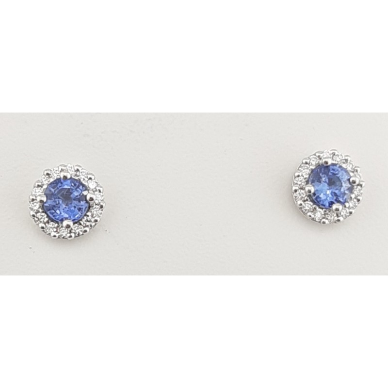 Pendientes en oro balnco de 18ktes 750mls , corona con piedra central zafiro azul 4,15mm de diámetro con un peso total de 0,68qtes ,y 28 diamantes talla brillante con un peso de 0,15qtes color H pureza VS , Medida del pendiente 6,80mm de diámetro y cierre a presión.