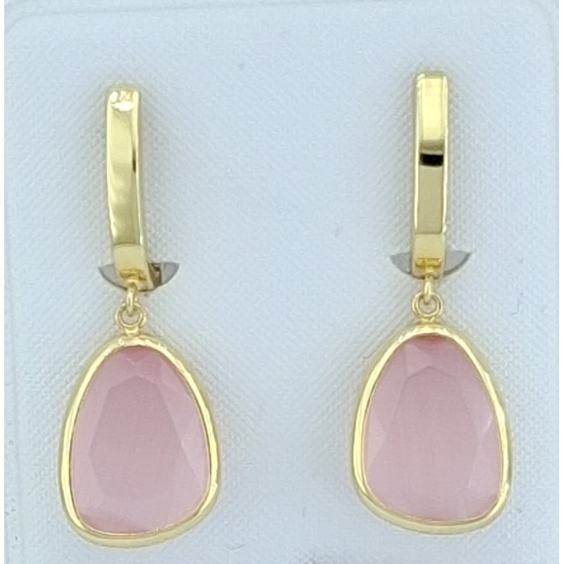 Pendientes para mujer en oro amarillo de 18ktes 750mls , pendientes con colgante y piedra cuarzo rosa , medida del pendiente 25,60mm de largo y cierre catalan.