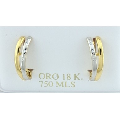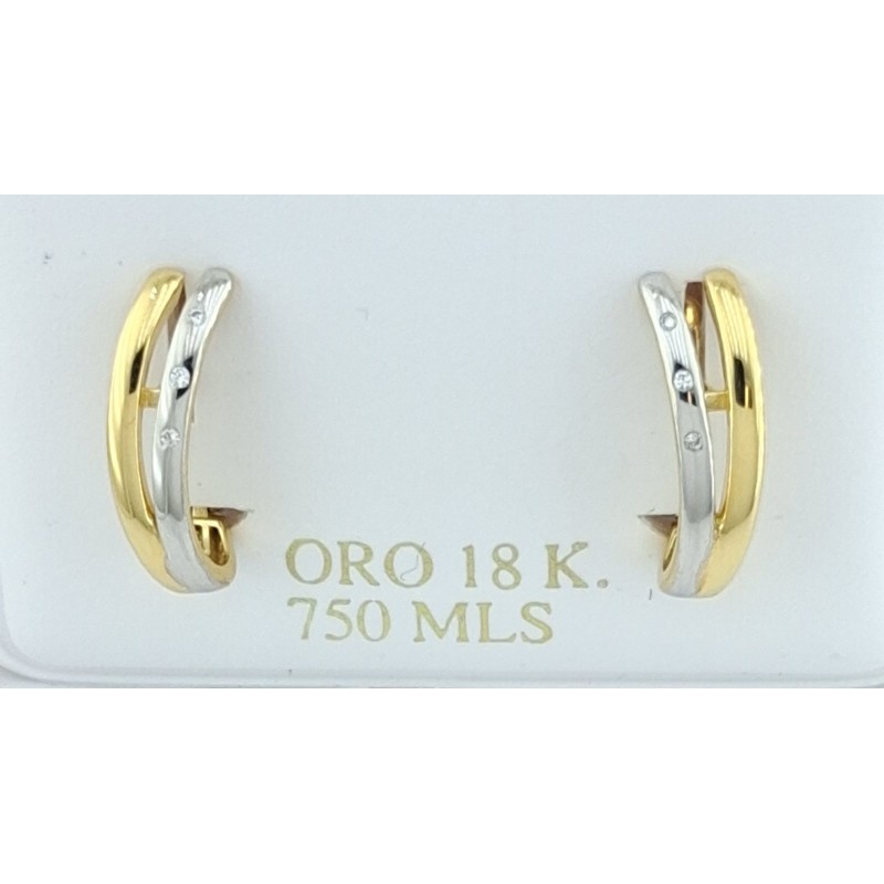 Pendientes para mujer en oro bicolor de 18kilates 750mls, pendientes de forma de dos tiras desplazadas y en el la barrita en oro blanco incrustadas tres circonitas blancas , cierre catalan , medida alto x ancho 16,50x4,50mm en definición