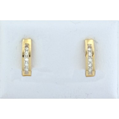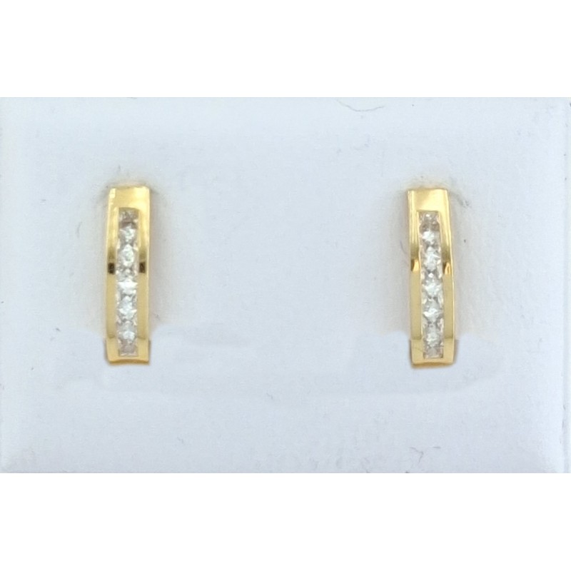Pendientes para mujer fabricados en oro amarillo de 18kilates 750mls , este pendiente en forma de medio aro tiene una fila de circonitas blancas transparentes en talla princesa engastadas en carril. En acabado pulido y cierre de tipo omega.