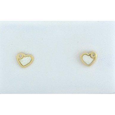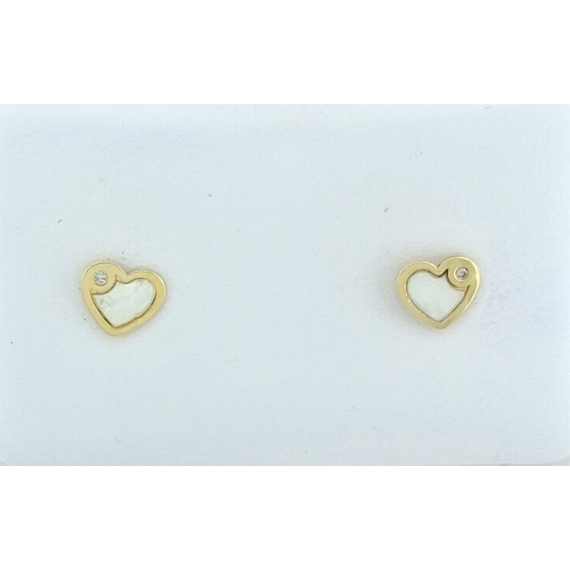 Pendientes en oro amarillo de 1ª ley 18kts 750mls, modelo de corazón con circonita blanca con nacar de madre perla natural y cierre a rosca y de tamaño altoxancho 5,00x5,80mm .