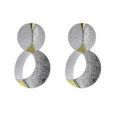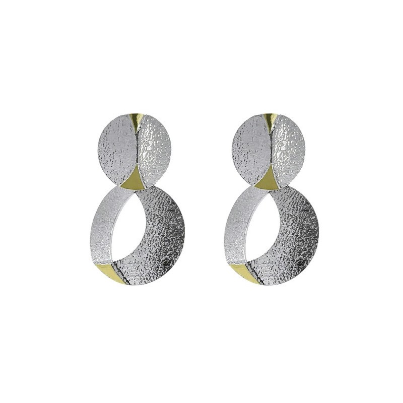 Pendientes en dos piezas de 25mm de largo por 15mm de ancho fabricados en plata rodiada y oro de 18k pulido. Una pieza moderna y original , cierre a presión