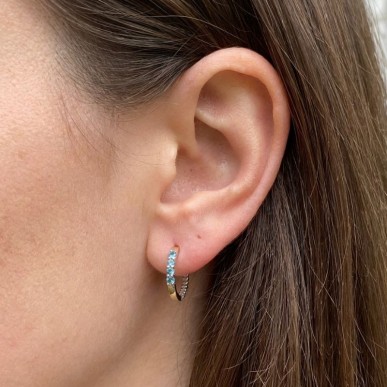 Pendientes en aros para mujer fabricado en oro de 9 kts y plata de 925 mls , aro de medida 20,00mm de diámetro y piedra calcedonia verde y dos tiras en oro amarillo de 9 kilates , cierre a presión .