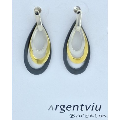 Pendientes para mujer en plata de 1ª ley 925 mls, pendientes con tres colgantes en forma de lagrima uno terminado en plata mate , uno en plata con baño de oro amarillo y uno en plata oxidada , medida largo 29,50 x11,80mm ancho, cierre a presión.