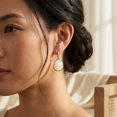 De la estructura pende una piedra blanca lechosa (nácar/cristal) con una exclusiva talla de faceta irregular de fantasía. Esta piedra está cuidadosamente enmarcada en un bisel de oro amarillo, creando un contraste cálido y sofisticado. Su silueta orgánica y fluida ofrece el equilibrio ideal entre el minimalismo moderno y la elegancia clásica femenina. Como es habitual en la firma, son hipoalergénicos y libres de níquel, garantizando una comodidad total incluso para las pieles más sensibles durante todo el día.