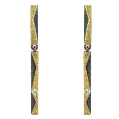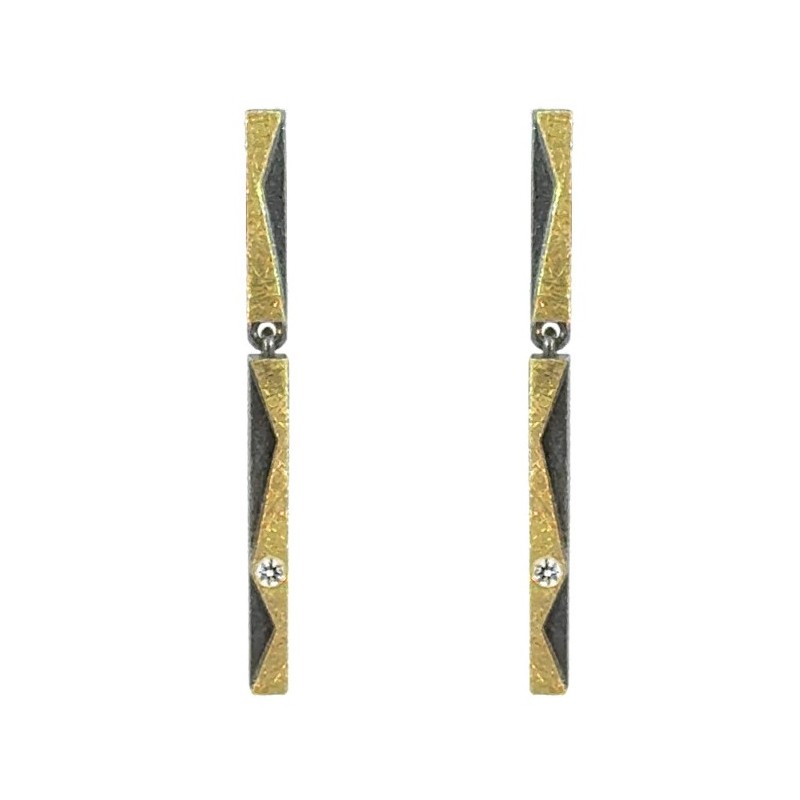 Pendientes con movimiento con cierre a presión de 4mm de ancho por 40mm de largo fabricados en plata oxidada, oro de 18k y brillantes creados en laboratorio de 0.060ct en total. Una pieza sofisticada que no pasará de moda nunca. Cierre a presión
