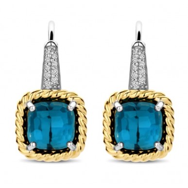 Acerca de esta joya Luce un estilo audaz y elegante con estos pendientes TI SENTO 78042DB de plata chapada en oro. Elaborados en plata de ley 925, estos pendientes de cierre de palanca presentan vibrantes piedras translúcidas de color azul oscuro con forma de cojín, facetadas para reflejar la luz con un brillo sutil. Los engastes de oro amarillo trenzado les confieren una riqueza de inspiración vintage, mientras que los ganchos chapados en platino, engastados en pavé con circonitas cúbicas blancas de talla brillante, añaden un brillo refinado y un contraste elegante. Su forma escultural y su tono intenso aportan profundidad y personalidad a cualquier look. Sin níquel e hipoalergénicos, estos pendientes ofrecen comodidad durante todo el día y un brillo atemporal.